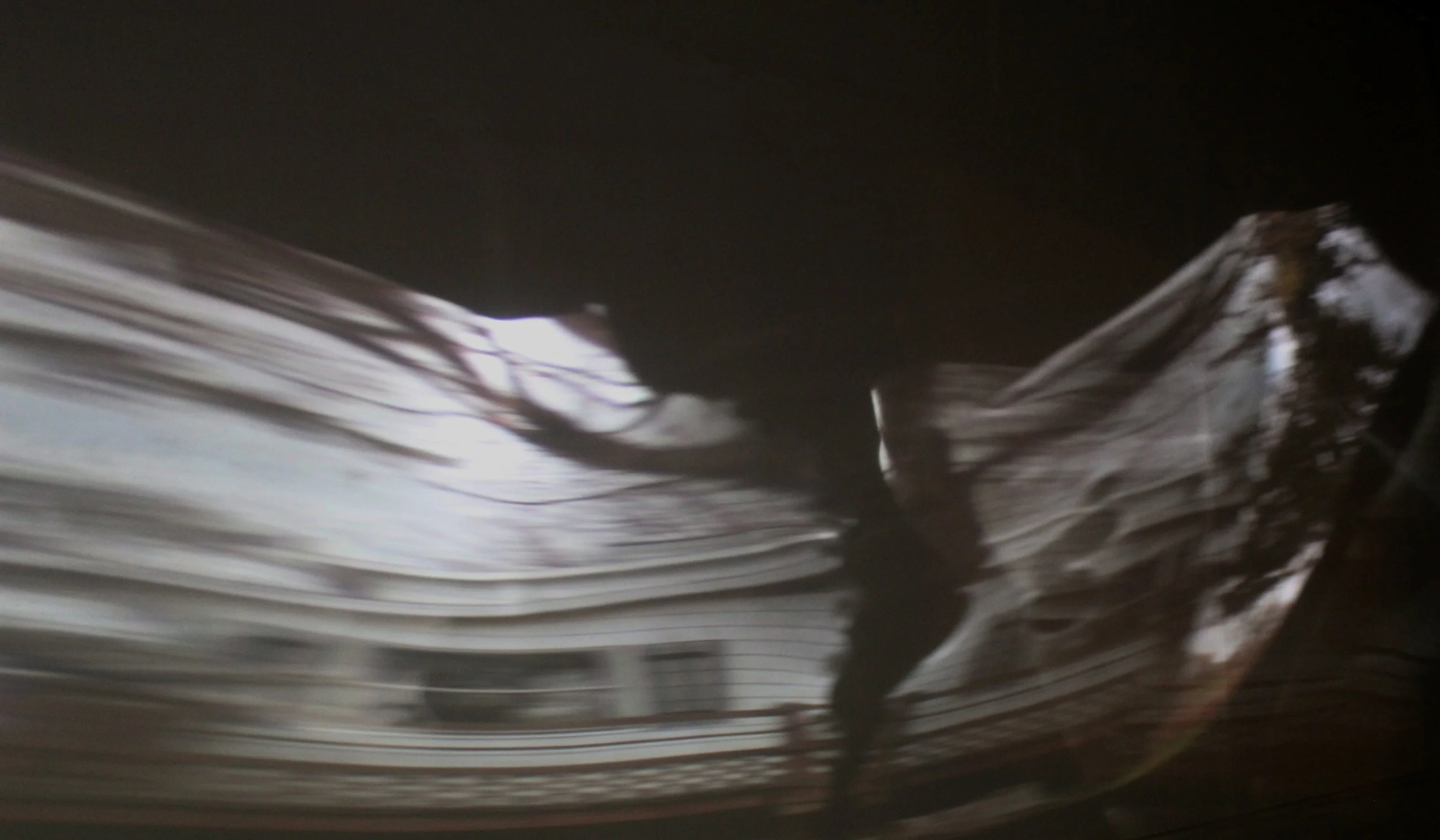 The installation has two convex panels that seamlessly meet in the center creating the feeling of the two sides of each frame entering one another. The installation can be viewed from either side. On the other side the panels are convex, and the image comes forward toward the viewer implicating them into the experience, and then turns away, leaving site as the next image emerges.