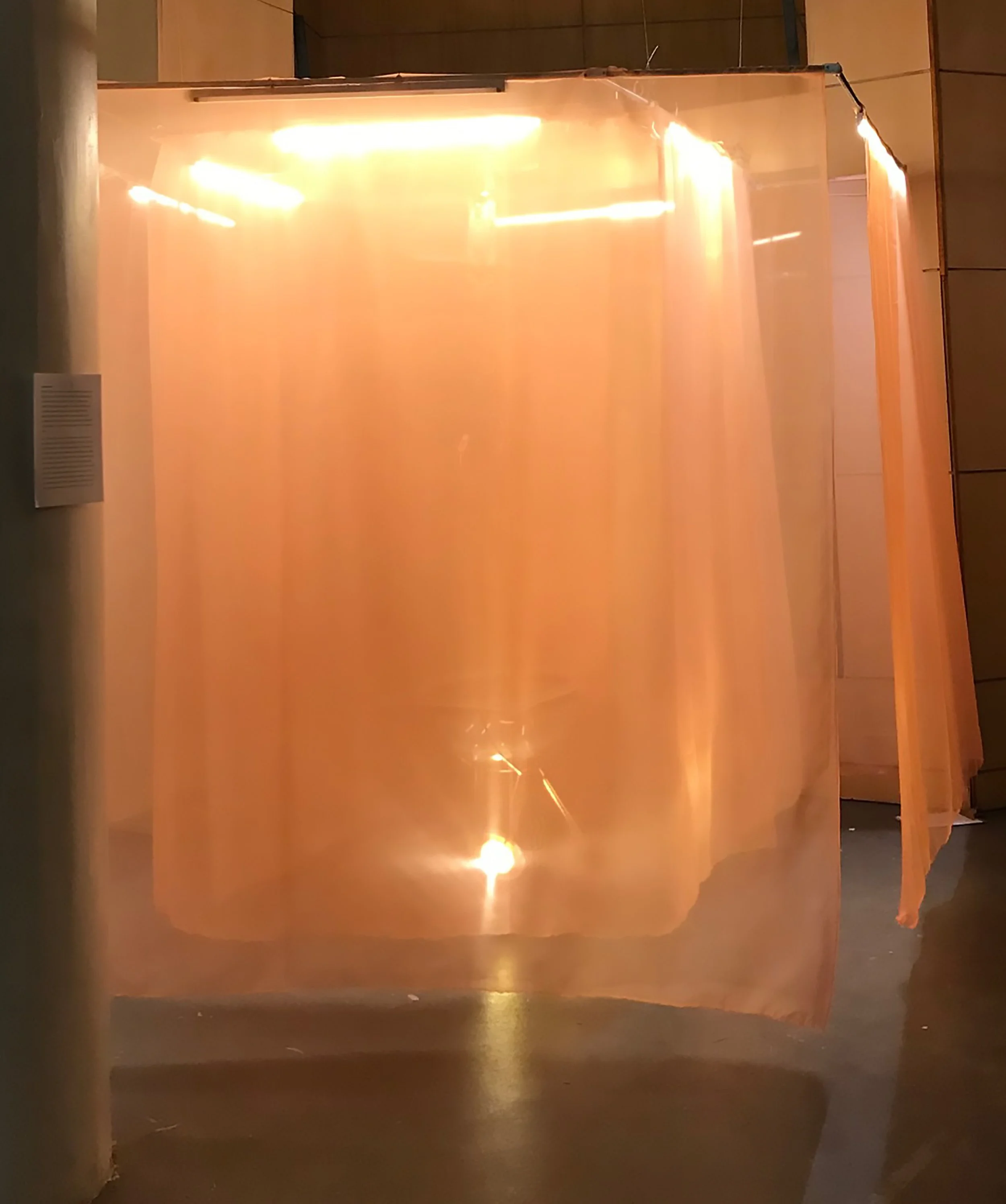 In the center of the room there is a concave rotating piece of clear material that holds the dancing dervish in a 3-dimensional form like a holographic version of himself spinning, suspended. This material throws the light body of the dervish around the room and the visage appears to leave and re-enter its body. There are 2 reflective sculptures simultaneously turning with the movement of the room contributing to the overall hypnotic feeling, while Tim Heckers'"Dropped Piano's" plays throughout the space.